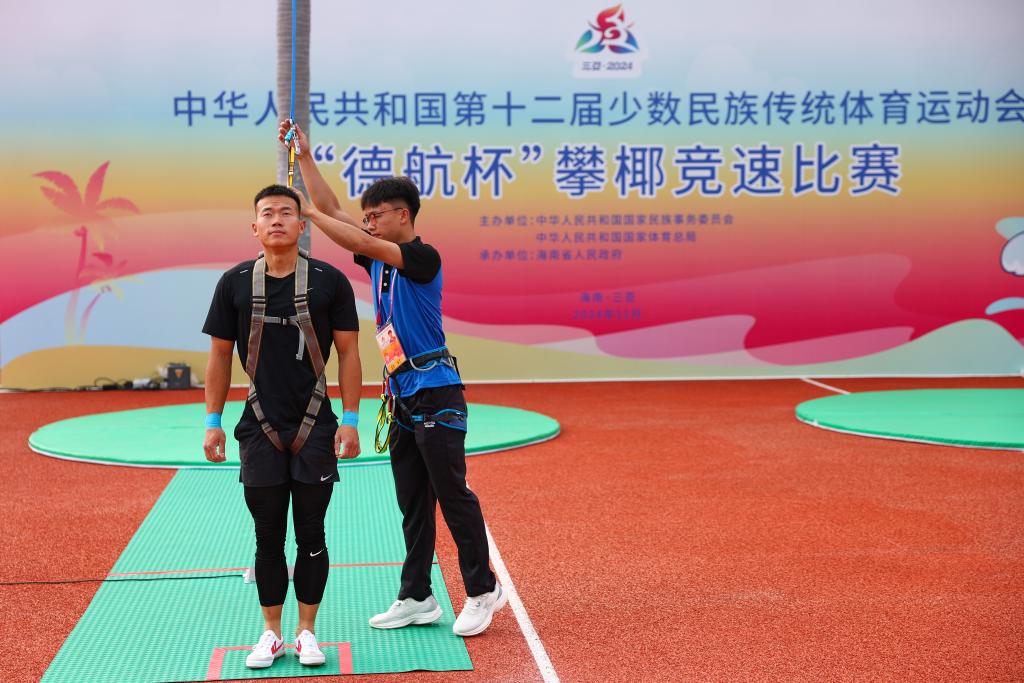 11月23日,工作人员为上海队选手付乐乐(左)系安全绳。新华社记者 杨植森 摄 在海南,椰子树是最常见的树种。徒手爬树摘椰子是海南当地群众...[查看详情]