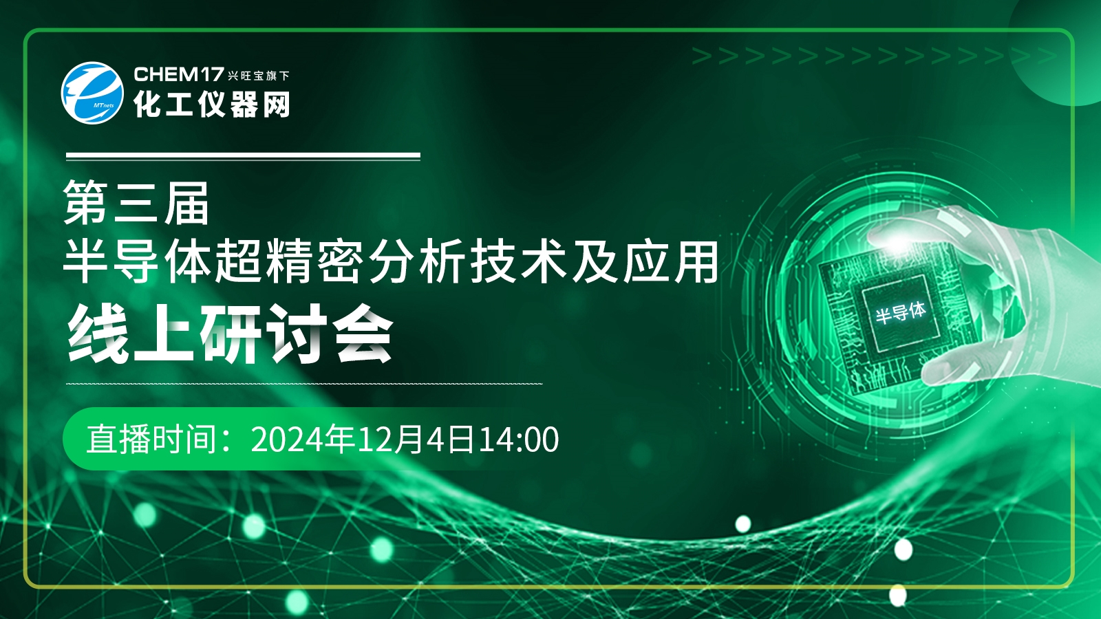 2024年12月4日14★:00★★,化工仪器网举办“第三届半导体超精密分析技术及应用”线上研讨会★,深入探讨半导体行业需求★★★、半导体高纯材料的研究动态和技术进展,为业内科研人员和企业研发人员开拓思路,助力半导体行业健康发展。