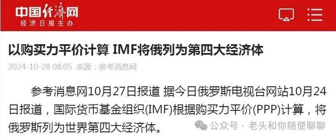 《参考消息网》10月27日报道称,据今日俄罗斯电视台网站10月24日报道★,国际货币基金组织(IMF)根据购买力平价(PPP)计算,将俄罗斯列为世界第四大经济体。