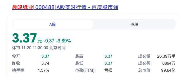 晨鸣纸业20日开盘即跌★★★,截至记者发稿时,午盘收报3★.37元/股★。总市值99.64亿元人民币。