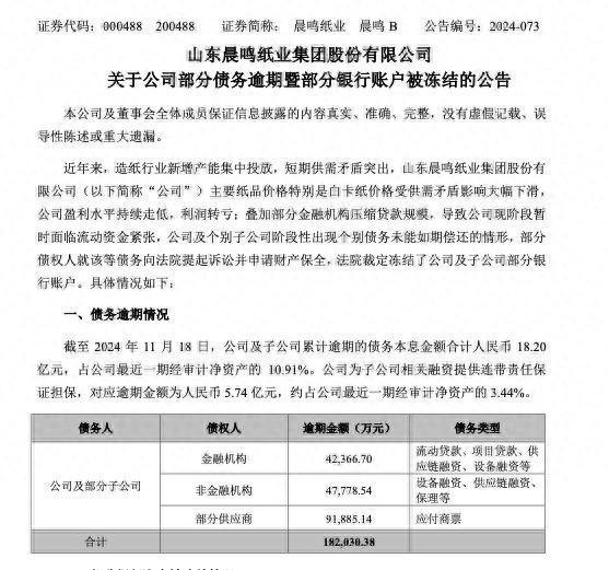11月19日晚间,山东晨鸣纸业集团股份有限公司(以下简称“晨鸣纸业★”或“公司”)发布关于公司部分债务逾期暨部分银行账户被冻结的公告。公告透露★★★,公司及子公司累计逾期的债务本息金额合计18.2亿元。公司目前超七成产能已停产,