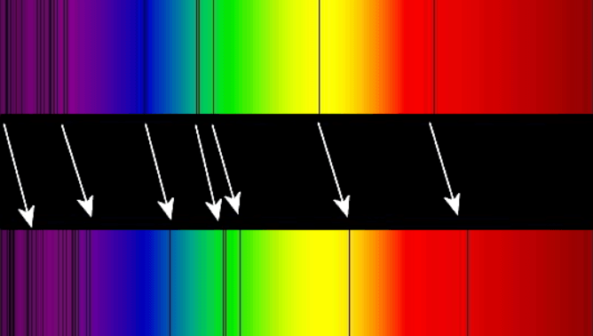 在下面的光谱中你可以看到一些下跌的线。这些下跌被称为“吸收谱线”,因为这只有当光源和地球上的观测人员之间有一些物质吸收了光时它们才会出现★★。吸收物质可以是恒星的扩展层或者气体或灰尘组成的星际云。
