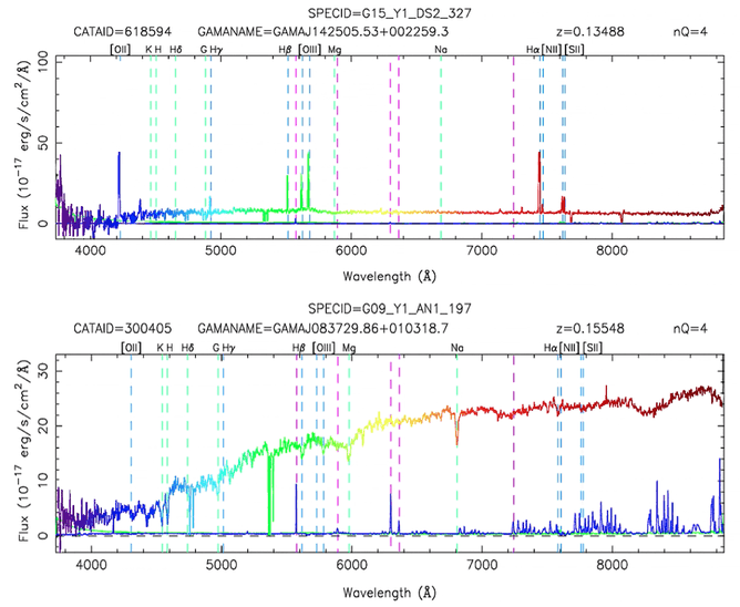 由此,我们知道星系光谱中的氢-阿尔法谱线的强度代表星系中有多少年轻的恒星。由于下面的光谱显示没有氢-阿尔法谱线,我们可以断定下面的星系没有光亮的恒星正在形成,而上面的星系则孕育着好多新恒星。