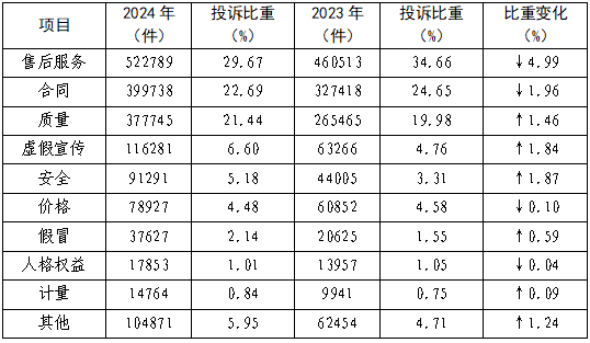 与2023年相比(如表1所示)★,安全★、虚假宣传、质量问题投诉比重上升,售后服务、合同、价格问题投诉比重下降。
