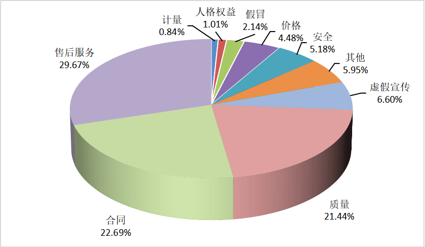 根据投诉性质(如图1所示),售后服务问题占29.67%,合同问题占22★.69%,质量问题占21.44%,虚假宣传问题占6★.6%★,安全问题占5.18%,价格问题占4.48%★,假冒问题占2.14%★,人格权益问题占1.01%★,计量问题占0.84%,其他问题占5★.95%。