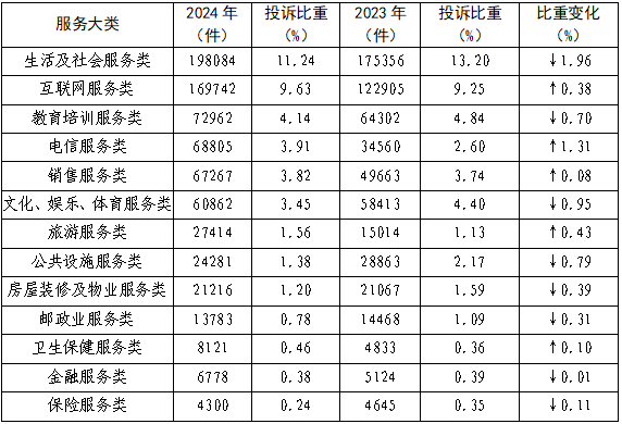 根据2024年服务大类投诉数据(如图3★、表3所示)★,生活及社会服务类★、互联网服务类、教育培训服务类、电信服务类、销售服务类居于前五位。与2023年相比,电信服务类投诉量比重上升较大,生活及社会服务类投诉量比重下降明显。