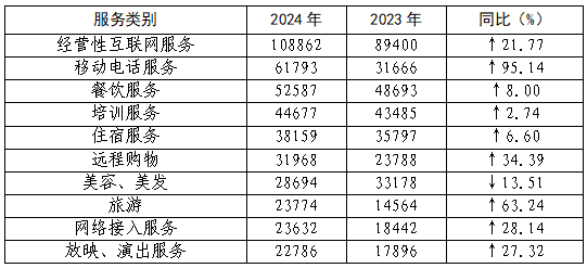 在具体服务投诉中,投诉量居前五位的分别为(如图5所示)经营性互联网服务★、移动电话服务、餐饮服务、培训服务★、住宿服务。与2023年相比★,移动电话服务★、旅游、远程购物投诉同比上升明显,美容、美发投诉同比有所下降。